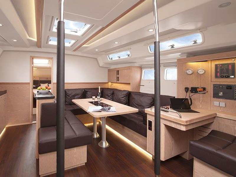 El. anchor windlass, Bathing platform, Bimini top, Cockpit shower, Cockpit speakers, Cockpit table, Dinghy, El. halyard winch, El. primary winch, Sprayhood, Steering wheel, Teak cockpit, Autopilot, Charts & pilot books, GPS plotter, Tridata, VHF radio, Battery charger, Bed linen, Electric refrigerator, Freezer, Galley equipment, Gas stove and oven, Hot water system, Inverter 12V to 220V, Radio/CD player, TV, Bow thruster, Genoa - roll, Full batten Main Sail