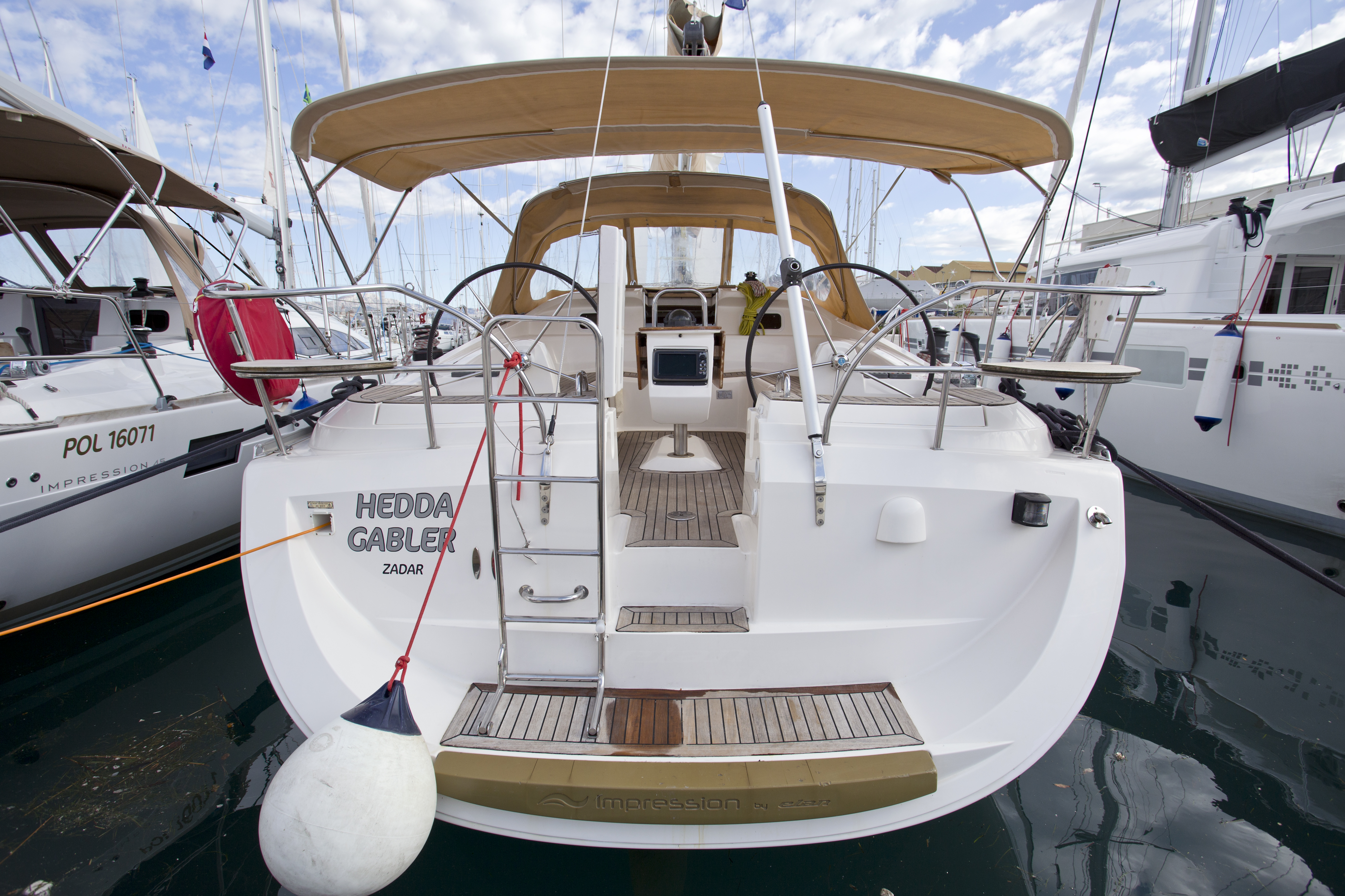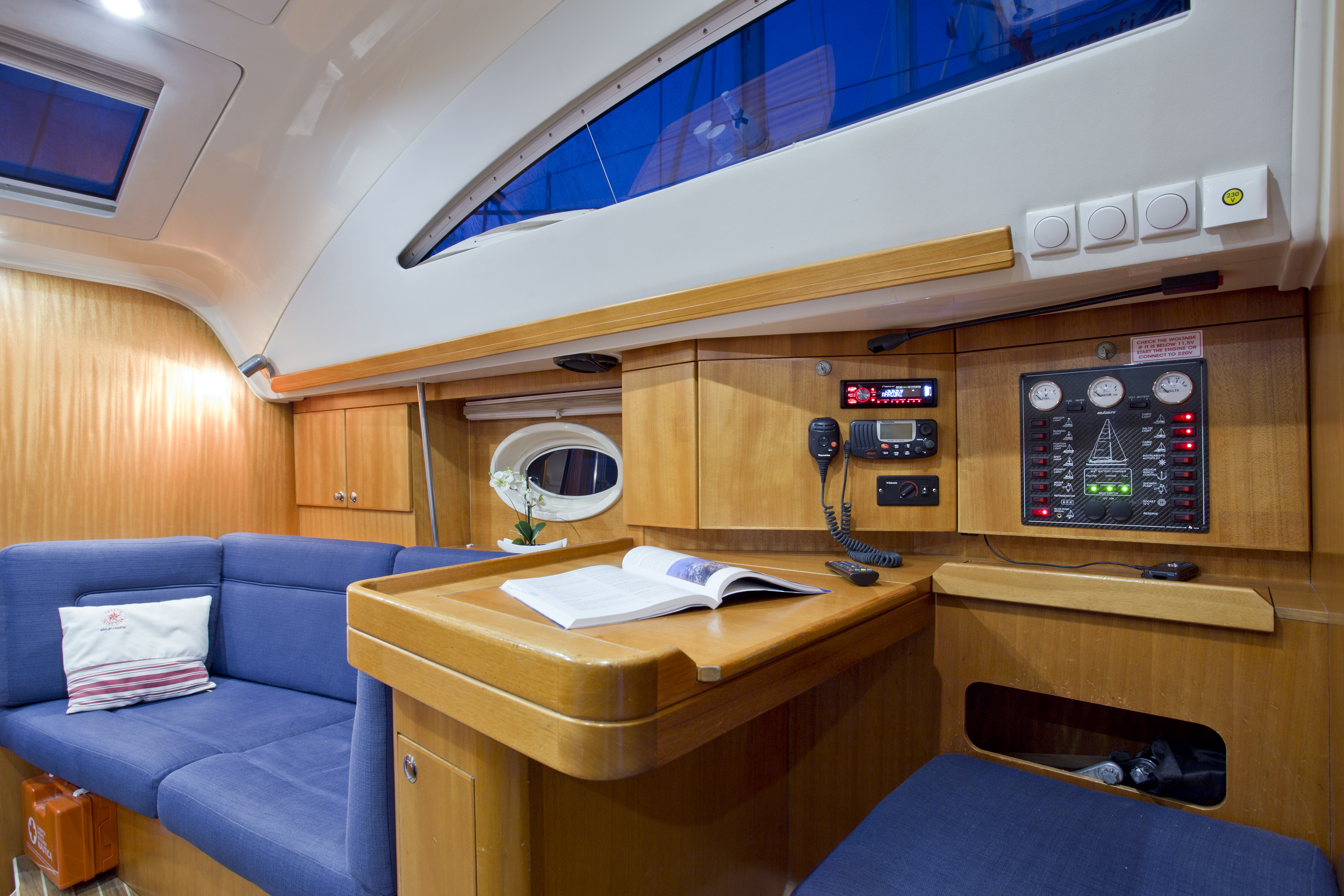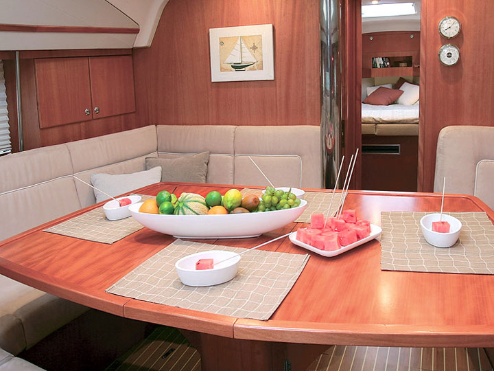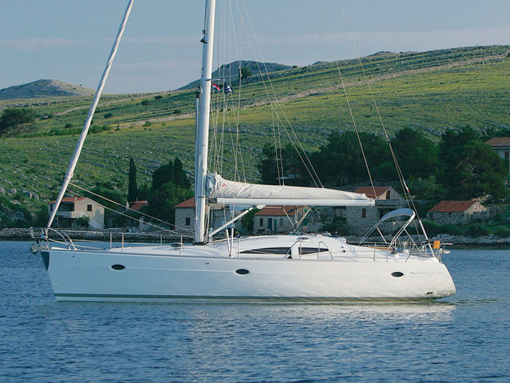 GPS plotter in cockpit, Autopilot, Bimini, Bowthruster, Cockpit table, Deck shower, Depth sounder, Dinghy, El. charger, Electric anchor winch, Electric bilge pump, Electric fridge, Furling Genoa, Hot water, Manual bilge pump, Nautical charts, Nautical guide, Self tackling winch, Stereo/CD, VHF, Bed sheets and towles, Kitchen equipment, Life jackets, Navigation equipment, Safety harnesses, Shore power, Heating, Sprayhood, Standard mainsail, 2 steering wheels, Folding propeler, Freezer , Holding tanks, New sails 2017, Pets are not allowed onboard