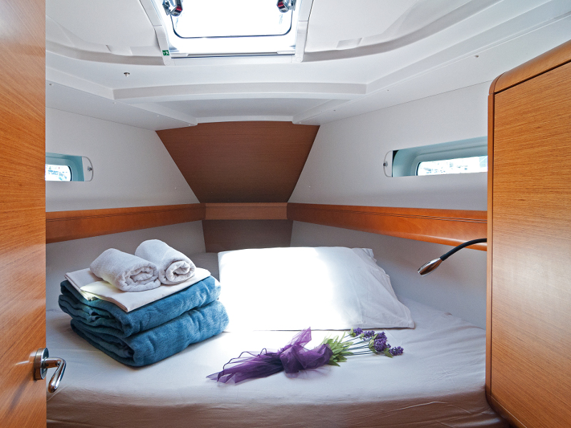 Bimini top, Cockpit shower, Cockpit table, Dinghy, Electric anchor windlass, Emergency tiller, Fenders, Furling genoa, Furling main sail, Main anchor + 50 m chain, Mooring ropes, Second anchor + rope, Autopilot, Depth instrument, Divider + plotter, GPS, Hand bearing compass, Harbour guides, Log/Speed instrument, Main compass, Navigation charts, VHF radio, Windex, Fire extinguisher, First aid kit, Horse shue buoy + light, Life belts, Life jackets, Rockets and Torches, Torch light, Wire cutter, Sprayhood, Bow thruster, Bedding, Towels