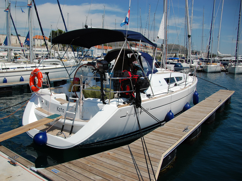 Outboarder, Furling/Roll main, GPS plotter in salon, VHF, Bimini Top, Sprayhood, Depth Sounder, Log Speed, CD Player, GPS, Deck Shower, Furling/Roll Genoa, Autopilot, Cockpit Table