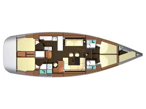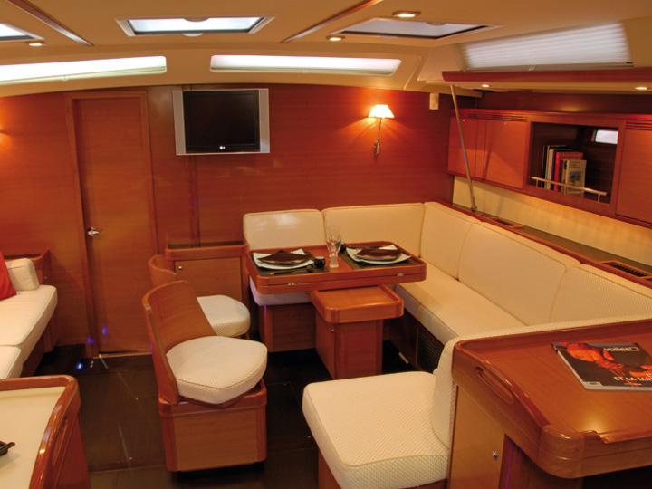 Bowthruster, Bimini top, Electric anchor, Furling genoa, Inflatable dinghy with pump, Steering wheel, Battery charger and 220V shore supply, Bucket, Cockpit shower, Deck brush, Galley equipment, Gangway, Gas bottles, Swimming ladder, Water hose, Anchor ball and cone, Anchors with chain and rope, Anemometer, Barometer - clock, Bilge pump, Binocular, Blunkets, Boat hook, Boats papers, Bosuns chair, Distress rockets, Divider, Diving mask, Emergency rudder, Engine spare parts, Fenders, Fire extinguishers, First aid kit, Flashlight, Fog horn, GPS, Hand compass, Horseshoe buoy with line and light, Italian flag, Life jackets for all guests on board, Life raft, Log, Mooring lines, Navigation ruler, Radar reflector, Safety belts, Sea charts and cruising guides, Tool box, Ture holes, VHF, Water pilot, Winch handles