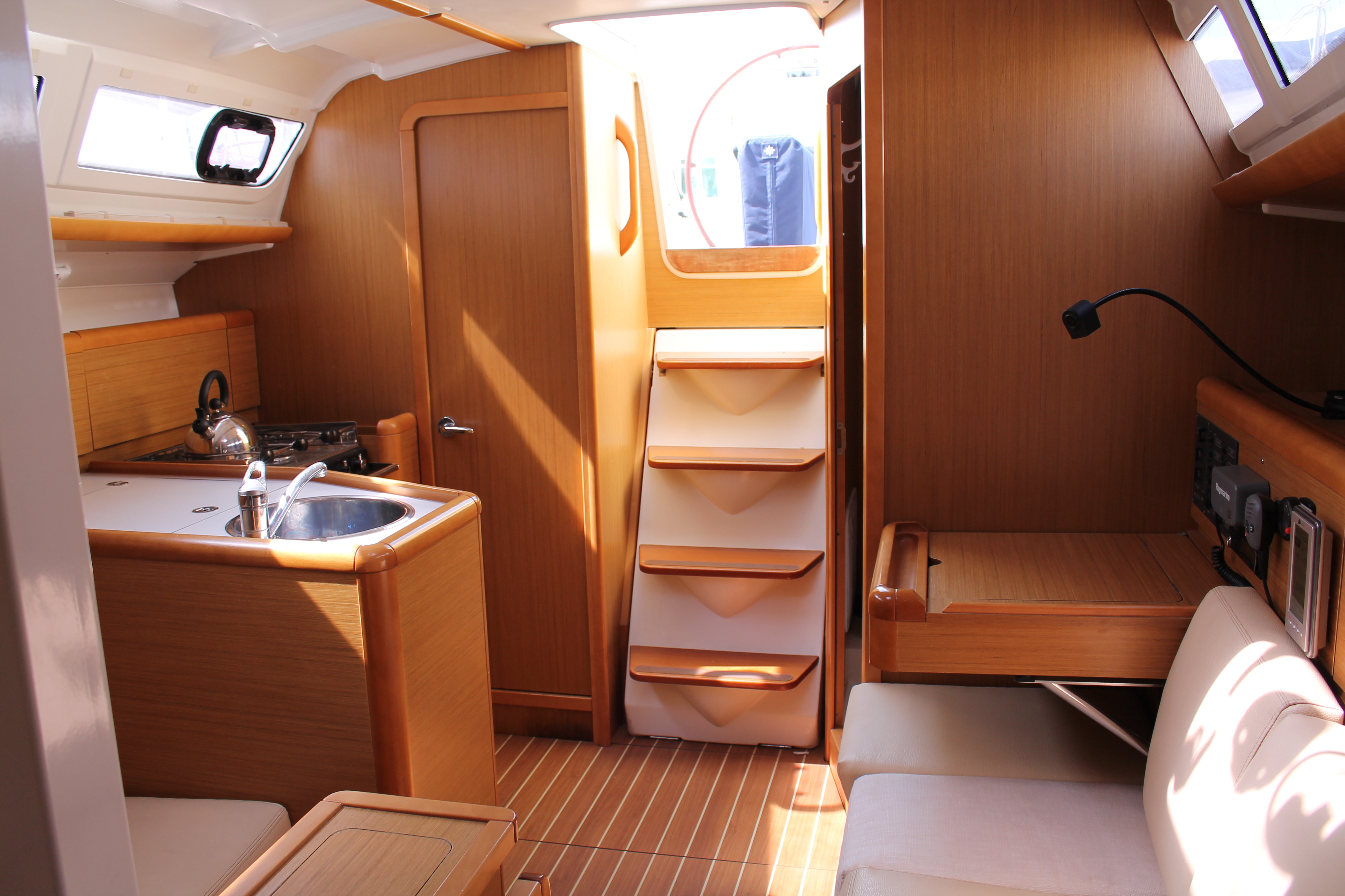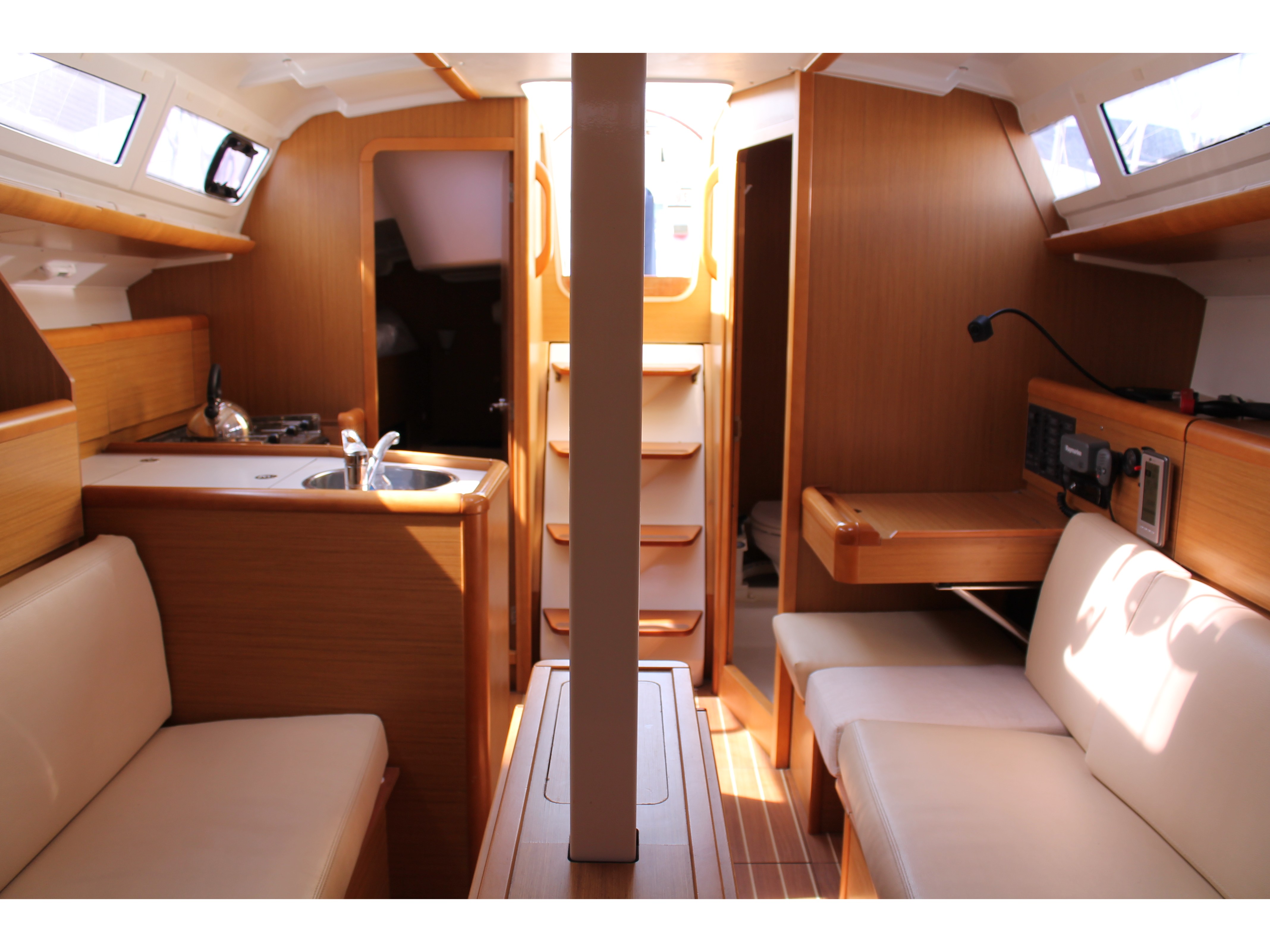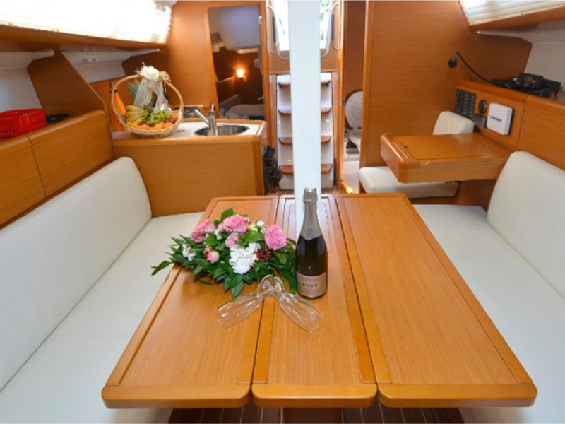 Anemometer, Autopilot, Battery charger, Bimini Top, Cartographic GPS, Cockpit cushions, Cockpit speakers, Cockpit table, Deck light, Deck shower, Dinghy, Echo Sounder, Electricity on board 12V and 220V, Electric windlass, Furling Genoa, GPS + plotter, Inverter, Lazy Bag, Log/Speedo, Radio CD Player, Shore power cable 220V, Sprayhood, Waste tank, Semi-full batten mainsail