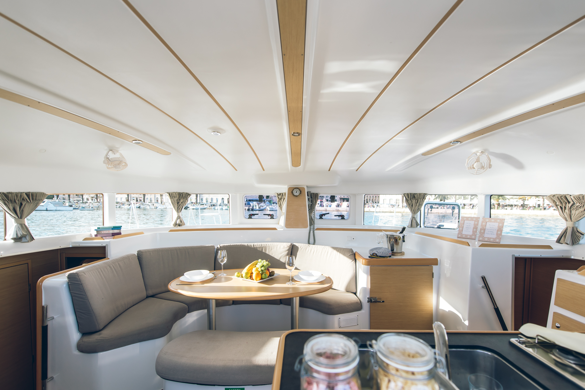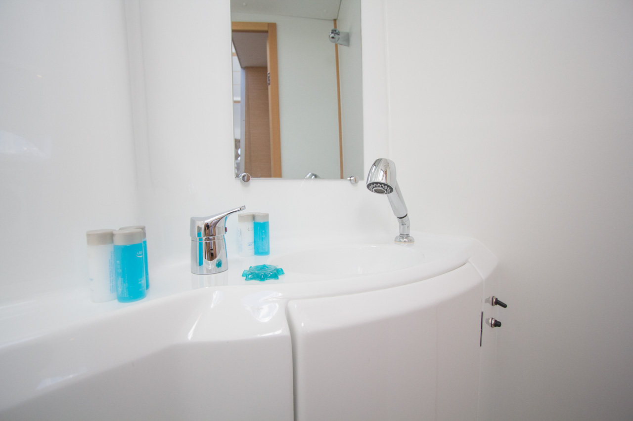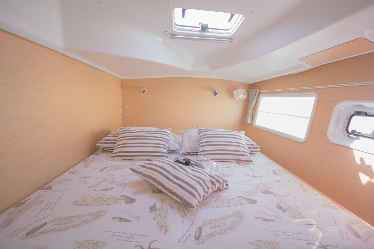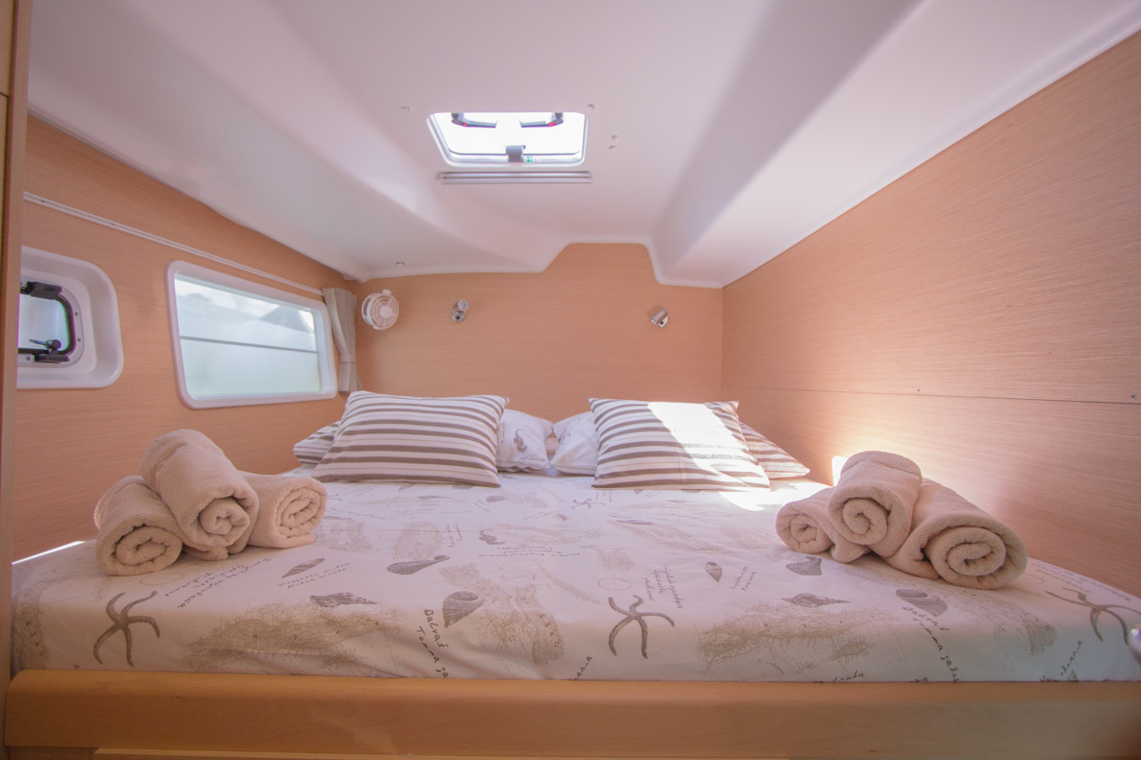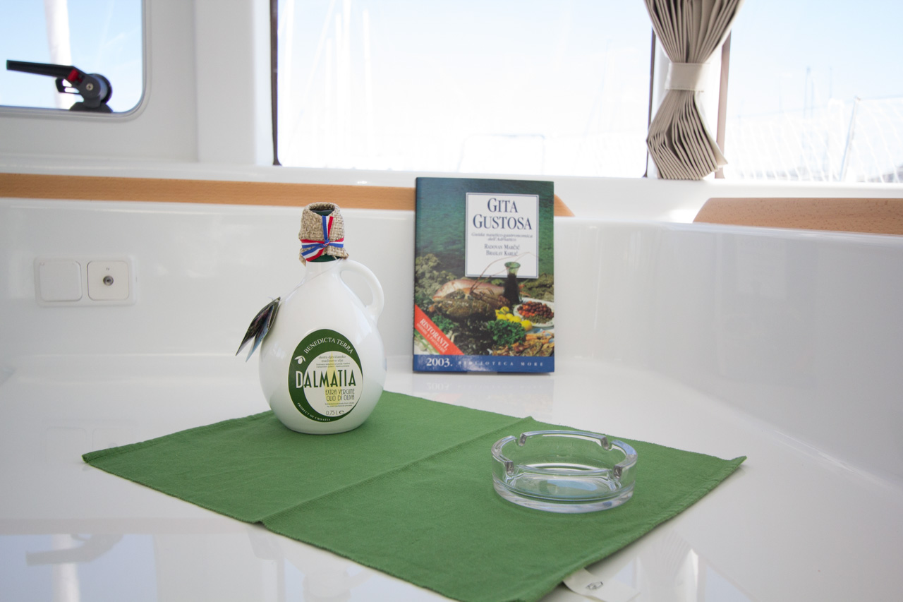 Bimini, sprayhood, battery charger, hand towels, Pillows and blankets, Heating, Linen, Rollgenua, Refrigerator, Deck Shower, Electric Windlass, Hot Water System, Cockpit Speakers, Radio/CD, VHF, Autopilot, GPS Chartplotter, First aid kit, Log/Speedo, Main Deck Compass, Lazy Bag, Windinstrument, Fire extinguisher, Navigation kit, Nautical charts and nautical guide, Anchor, 220 V shore connection, Cutlery, dishes, gas stove, Standard main sail, Gangway, dinghy 3.10 m with outboard engine 10 HP, Solar Panel, inverter, Auxiliary anchor, Distress flares, Lifebuoy, Life jackets, Safety harness, Cooker (num.), Sinks (num.), Cushions in cockpit, sun tent in cockpit, fans in cabins, fans in saloon