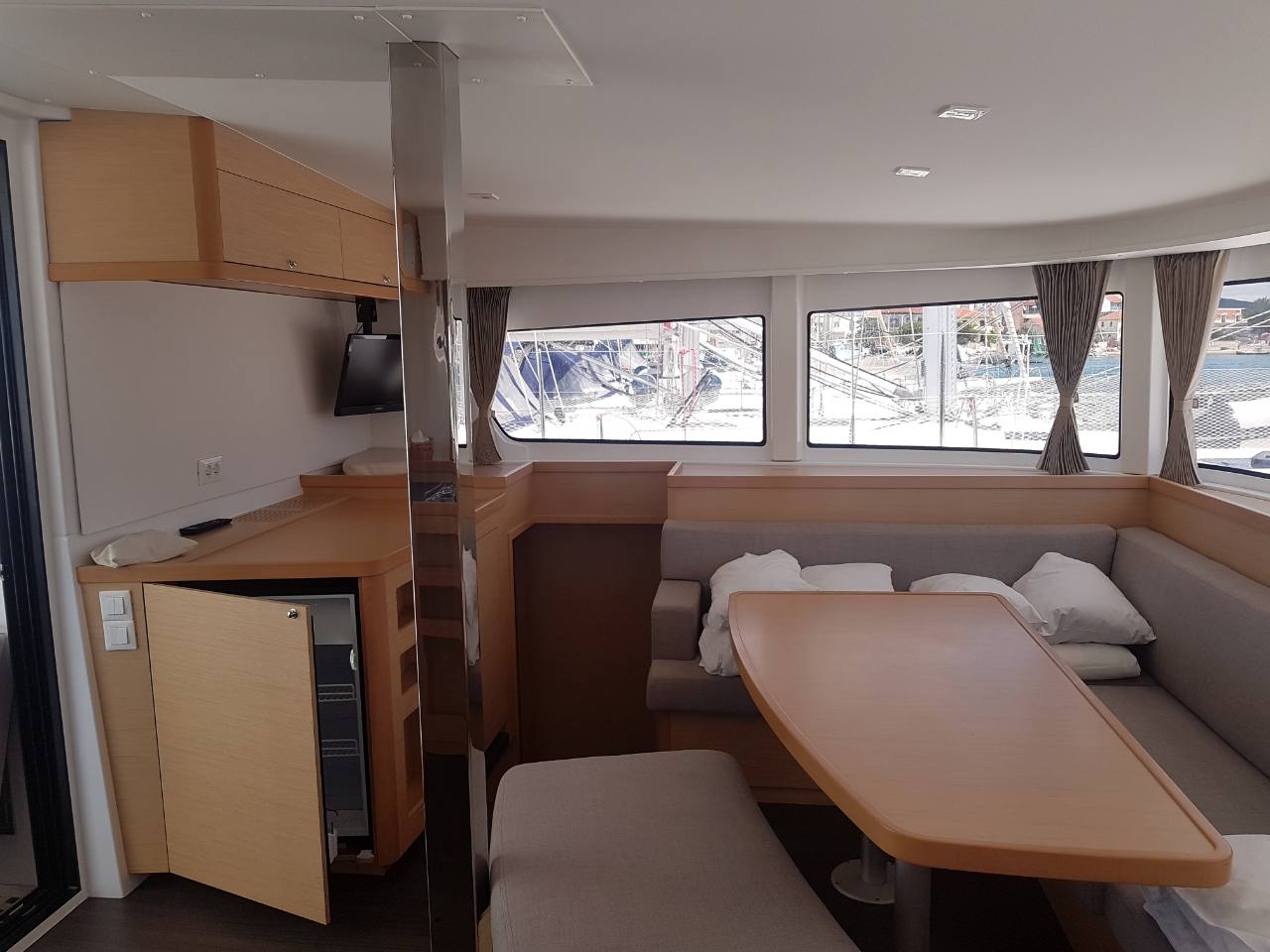 Autopilot, Battery charger, Cockpit shower, Depth speed, LCD TV with DVD or USB, Electrical bilge pump, Electrical water pump, Electric windlass, GPS chartplotter in cockpit, Hot water, Motor battery, Outside speakers, Radio with CD or MP3 player, Refrigerator 12V, Roll genoa, Service battery, VHF, Wind, Anchor + chain, Black ball, Black cone, Boat hook, Bucket, Deckbrush, Dinghy, Emergency helm, Funnel, Gangway, Gas bottles, Jerrycan for fuel, Jerrycan for water, Lifebuoy with light, Oars for dinghy, Outboard engine holder, Pump for dinghy, Radar reflector, Round fenders, Second anchor + chain, Shore power line, Sponge, Water hose, Barometer, Binocular, Clock, Divider, Handbearing compass, Navigation charts set, Navigation ruler, Pen and pencil set, Pilot book, Triangle, Bosun chair, Distress flares box, Fire extinguishers, First aid kit, Flash lamp, Foghorn, Tool set, Windlass handle, Windlass remote control, Life jackets, Flat fenders, Life raft, Aircondition, Heating, Radar, Generator, Bimini, Electric Deck Winch, Full Battened Mainsail, Lazy bag, Flybridge, Solar Charger, WiFi
