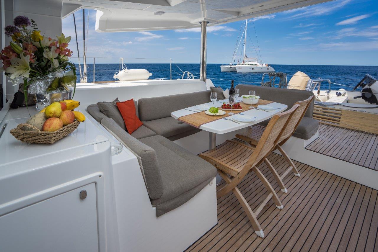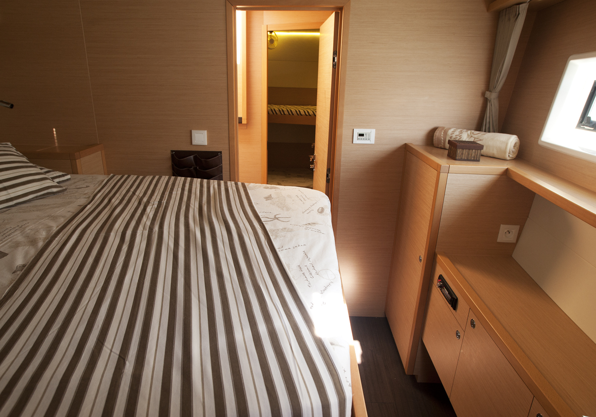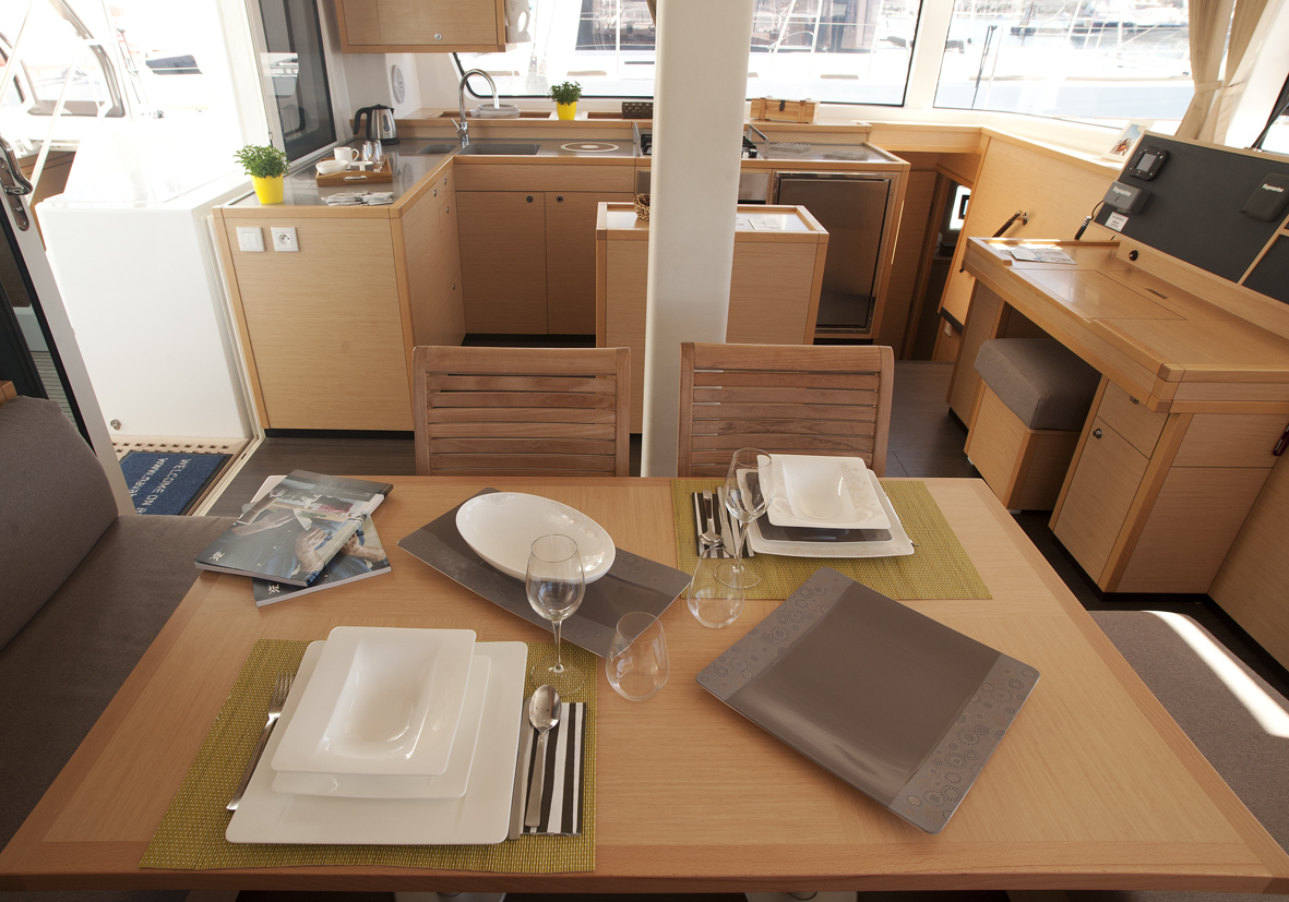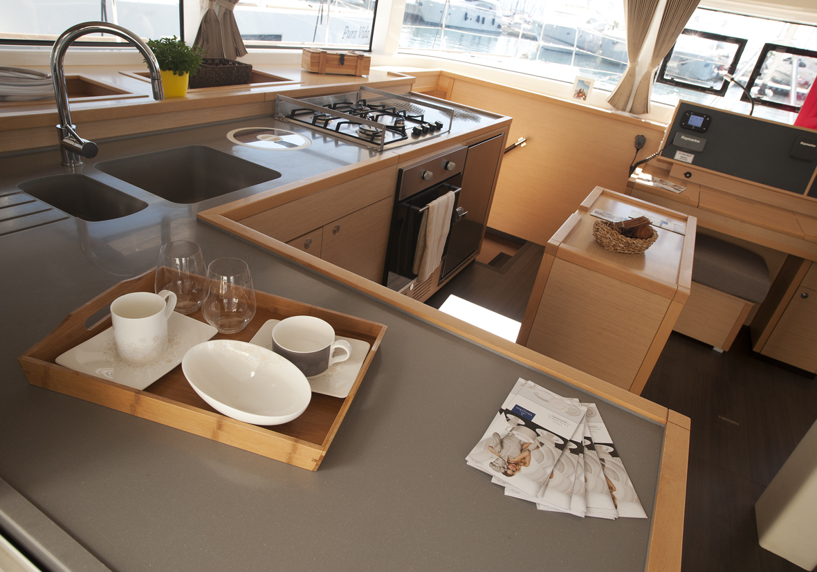 Dinghy Rigid, Outboard engine, 220 V shore connection, electrical toilet, Engine Battery (in Ah.), Generator, Service Battery (in Ah.), Shore Power Connection, Cockpit Speakers, Radio/CD, TV + DVD, Cutlery, dishes, icemaker, Refrigerator, Sinks, Autopilot, GPS Chartplotter, Log/Speedo, Main Deck Compass, Air Conditioning, Hot Water System, Standard main sail, Rollgenua, Bathing Platform, Cockpit Fridge, Electric Windlass, Gangway, Bow Thruster, hand towels, Linen, underwater lighting, Auxiliary anchor, Calibrated anchor chain, Distress flares, Fire extinguisher, First aid kit, Lifebuoy, Liferaft, Main anchor, Safety harness, 2 person Kayak, S.U.P., Snorkel Equipment, water ski, beach towels, Life jackets, water heater, Watermaker, Bimini, sprayhood, teak cockpit, VHF, Heating, Freezer, gas stove, battery charger, Nautical charts and nautical guide, Pillows and blankets